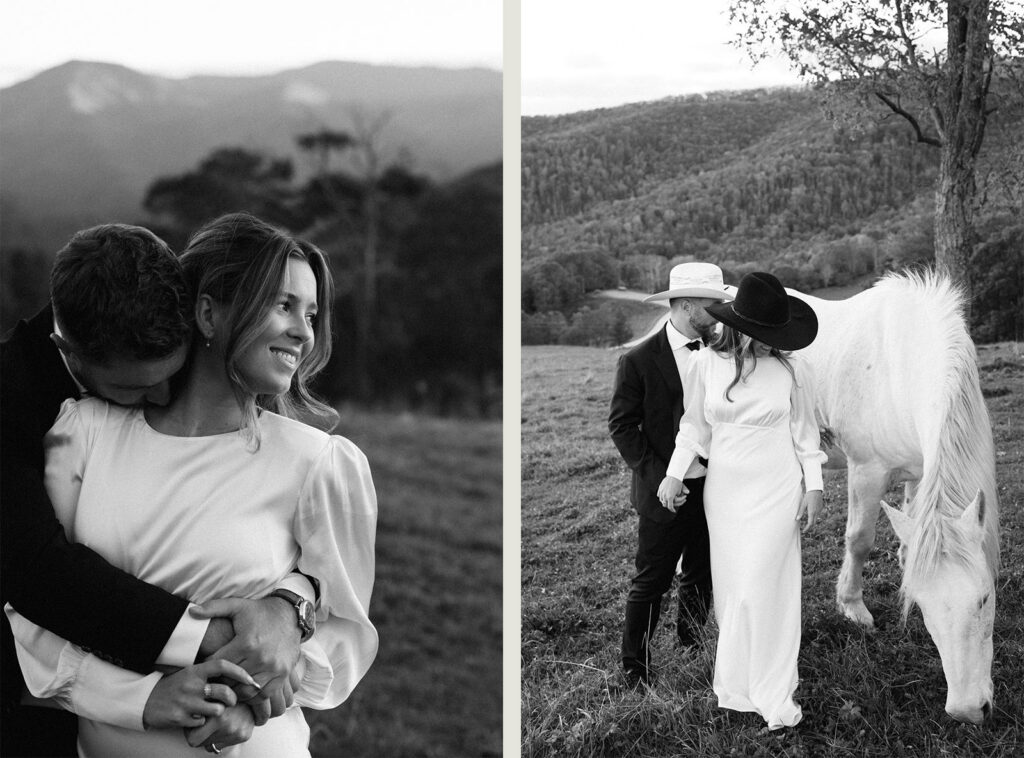 They started the day in a small chapel tucked into Maggie Valley—a civil ceremony, simple and grounded. Afterward, we returned to their cabin to continue the wedding festivities at Cataloochee Ranch, perched high above the Blue Ridge Mountains. Cataloochee Ranch has the kind of view that stretches long and wide, where the sky meets the hills with no real hurry.